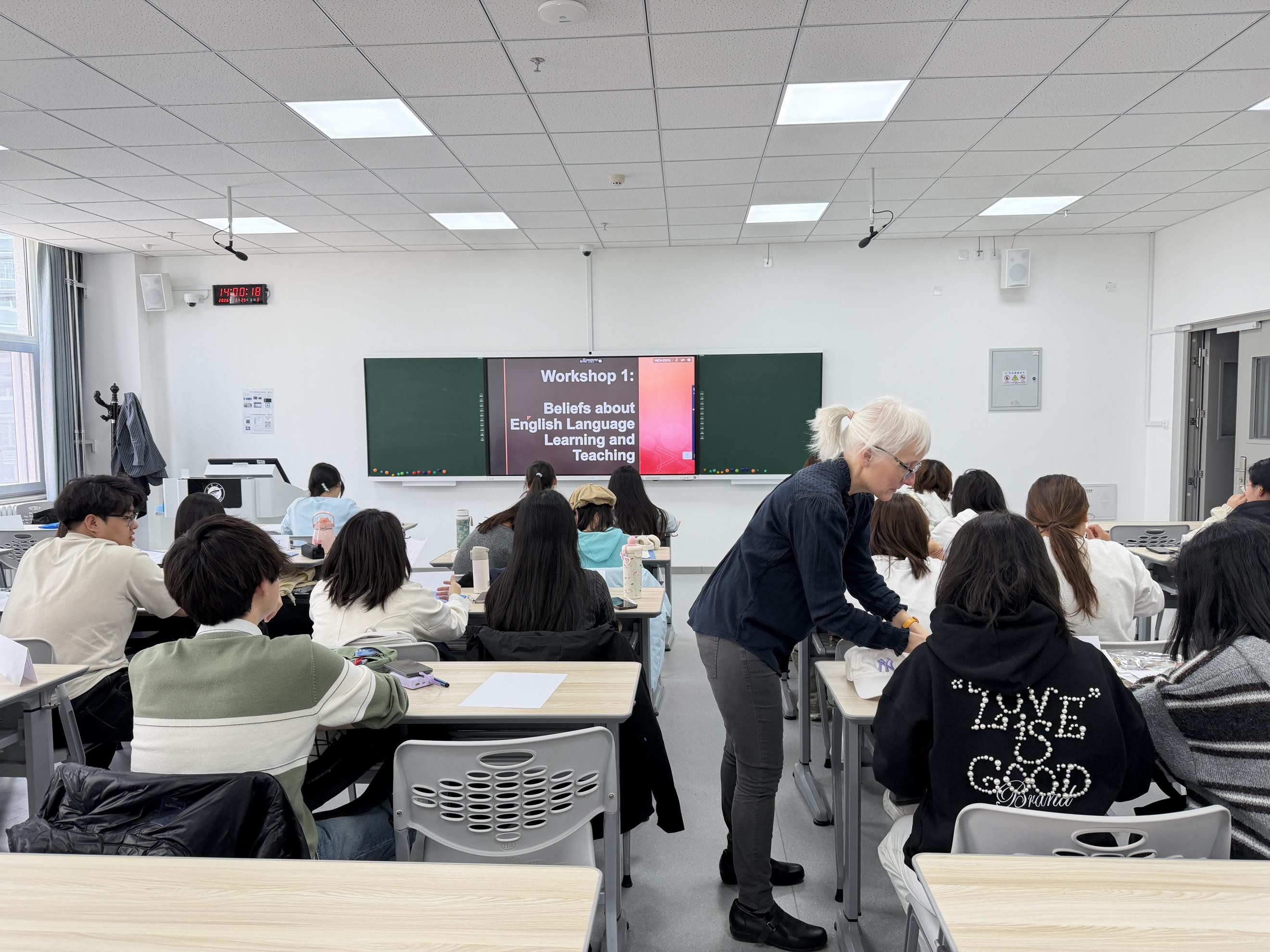 3月18日与3月23日下午,外国语学院在贺兰山校区笃行楼207教室和407教室,分别为2025级英语师范1班和2班学生举办了“卓越教师培养计划”首场教学工作坊。本次工作坊以“Beliefs about English Language Teaching and Learning”为主题,特邀英语教学法领域专家Melissa K. Smith博士主讲,旨在引导未来教师审视并重构自身教与学的信念,为后续课堂实践与教学研究奠定扎实基础。